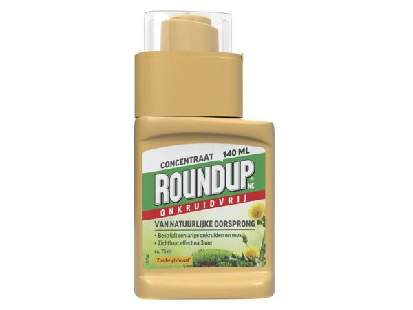 ROUNDUP® NC Natuurlijk Onkruidvrij Onkruidverdelger Concentraat 140ml is een snelwerkende onkruidverdelger van natuurlijke oorsprong. De werkzame stof in deze ROUNDUP® onkruidbestrijder is een grondstof die voorkomt in de natuur. ROUNDUP® NC is snel biologisch afbreekbaar in de bodem. Het middel bestrijdt alle bovengrondse delen van het onkruid. De eerste effecten zijn zichtbaar binnen 3 uur. Omdat ROUNDUP® NC alleen op basis van bladcontact werkt, kan het product niet preventief worden gebruikt op oppervlakken zonder onkruiden en het vermindert de kieming van zaden niet. Geschikt voor het bestrijden van onkruiden tussen sierbeplanting. Kan gebruikt worden in de moestuin, voor opkomst van het gewas. Ideaal te gebruiken voor onkruiden tussen bestrating, grind, beton en onverharde terreinen.